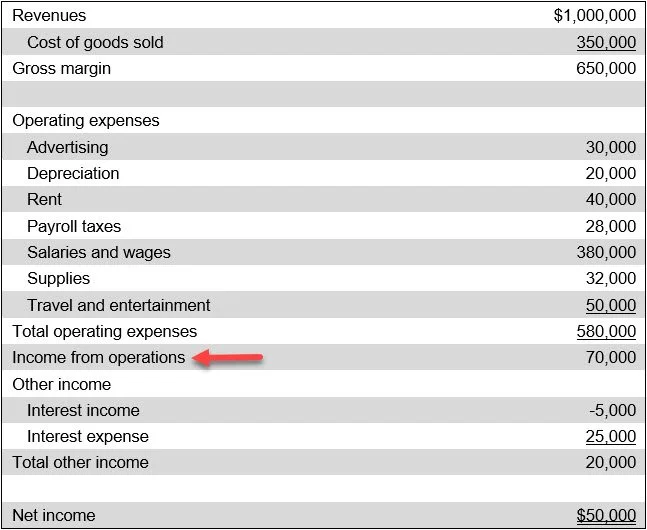 A company reports $1,000,000 of sales, $650,000 cost of goods sold, and $325,000 of operating expenses. Its income from operations is $25,000. To determine whether it is a viable business, it is still necessary to factor in the impact of the non-operating items mentioned earlier.