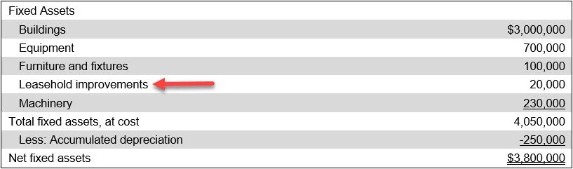 For presentation purposes, a leasehold asset is usually consolidated with the other fixed asset accounts of a business, so that only a single fixed assets line item is presented on its balance sheet. The ending balance in the leasehold asset account is usually considered too immaterial to be worth presenting separately. If it were to be presented, it might appear as noted in the following exhibit.