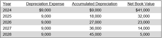 At the end of year 5 (2028), the net book value of the asset equals its salvage value ($5,000), and no further depreciation is recorded.